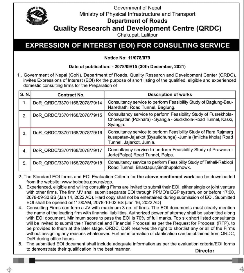 यसका लागि सम्भाव्यता अध्ययनका लागि सडक विभागको गुणस्तरीय खोज तथा विकास केन्द्र (क्युआरडीसी)ले सूचना जारी गरिसकेको छ ।