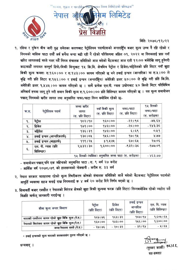 आयल निगमले नोक्सानी बढेको भन्दै इन्धनको मूल्य बढाएको हो।