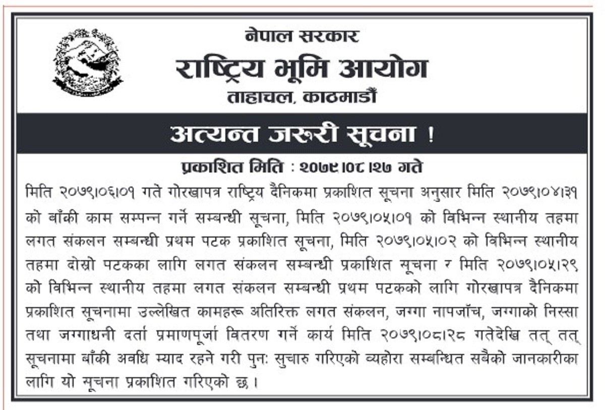 काठमाडौं- राष्ट्रिय भूमि आयोगले विभिन्न स्थानीय तहमा लगत संकलनसम्बन्धी काम फेरि सुरू गर्ने भएको छ।