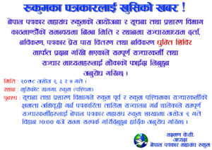 पत्रकारले प्रेस प्रतिनिधि प्रमाणपत्र पाउनका लागि सञ्चार प्रतिष्ठानबाट पाएको नियुक्ती पत्र, सिफारिश, श्रमजीवी दरबन्दी विवरणलगायत आवश्यक कागजात अनिवार्य रुपमा पेश गर्नुपर्ने विभागले जनाएको छ ।